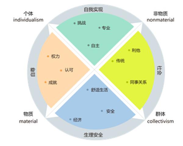 在崗位匹配、團隊匹配這兩個維度上,卓眾獵頭已經有相應的測評工具, 在這個全新的鐵三角模型里,針對組織匹配這一維度,卓眾獵頭提出了全新的“真北”工作價值觀分析模型(“真北“者,真正的北方也,此處象征最真實的內在需求)。該模型利用個人需求的個體——群體傾向性,以及物質——非物質傾向性,將人的工作價值觀分為四大類,分別是:注重個體需求和非物質需求的自我實現型、注重個體需求和物質需求的自尊型,注重群體需求和非物質需求的社會型以及注重群體需求和物質需求的生理安全型。每一類價值觀都對應著三條具體的衡量指標,共計覆蓋了12個員工“最想要”的價值需求點。通過一套科學的測試題目,企業可以更加準確地定位員工個體的價值取向,從而幫助企業在透徹了解員工價值觀與組織價值觀的匹配程度的基礎上,實施正確的員工激勵,最終減少核心員工的離職。