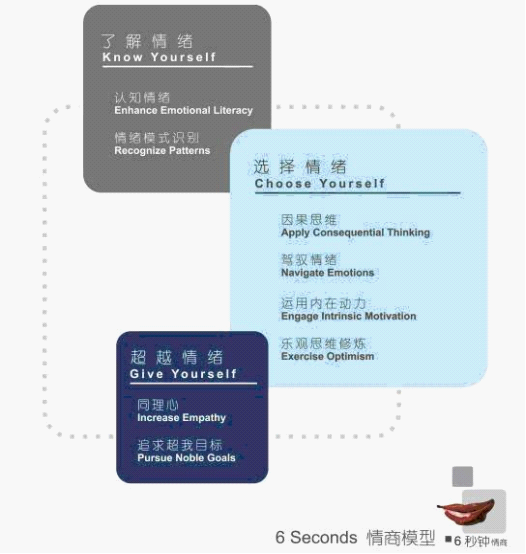 了解情緒明確了“在做什么”、選擇情緒告訴你“怎樣做”,而超越情緒就指出“為什么這樣做”。超越情緒聽起來似乎更像佛家禪語,事實上,它是6 秒鐘情商模型最顯著的特點。當我們的日常行為與自我內心深處的渴望達到一致時,我們將會做出最合理的抉擇,最大程度地發展自我駕馭能力,最有效地承擔對他 人的責任。