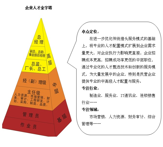 卓眾在進(jìn)一步優(yōu)化與完善傳統(tǒng)獵頭服務(wù)模式的基礎(chǔ)上,主要定位于為大量的發(fā)展中的企業(yè),特別是民營企業(yè),提供專業(yè)的人才配置服務(wù),并根據(jù)民營企業(yè)的人力資源策略、對(duì)人才需求結(jié)構(gòu)的特點(diǎn),將專業(yè)的獵頭服務(wù)擴(kuò)展到企業(yè)需求量更大的中層團(tuán)隊(duì)。